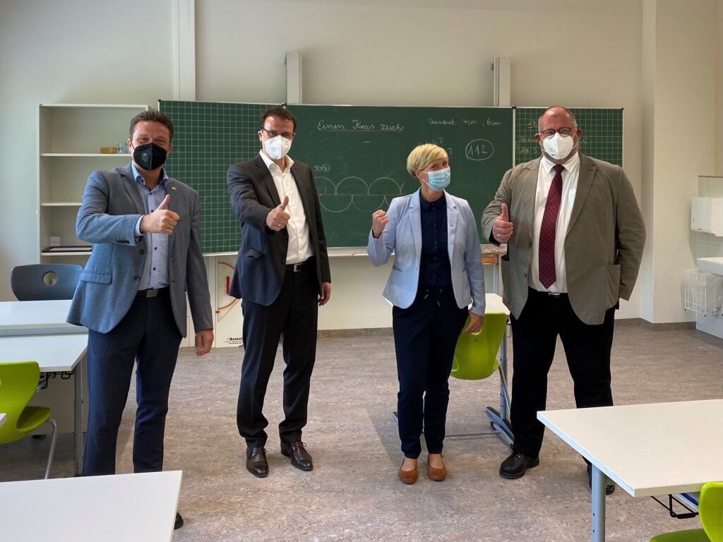 Zweijährige Bauzeit Nach drei Container-Schuljahren wurde die Rulamanschule heute offiziell eröffnet. Durch den Brand des Gebäudes am 23. Juli 2018 musste die Schule in rund zweijähriger Bauzeit wiederaufgebaut werden. Staatssekretär Volker Schebesta aus dem Ministerium für Kultus, Jugend und Sport überbrachte Bürgermeister Roland Deh die Glückwünsche der Landesregierung.