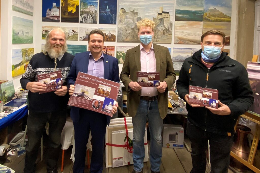 13 gemalte Bilder von Schloss Lichtenstein Heute Abend hat Johann Hölz gemeinsam mit Schlossherr Karl-Philipp Fürst von Urach seinen neuen Fotokalender für das Jahr 2022 mit 13 von ihm gemalten Bildern von Schloss Lichtenstein im Kunsthaus „Alte Schule“ in Undingen präsentiert.