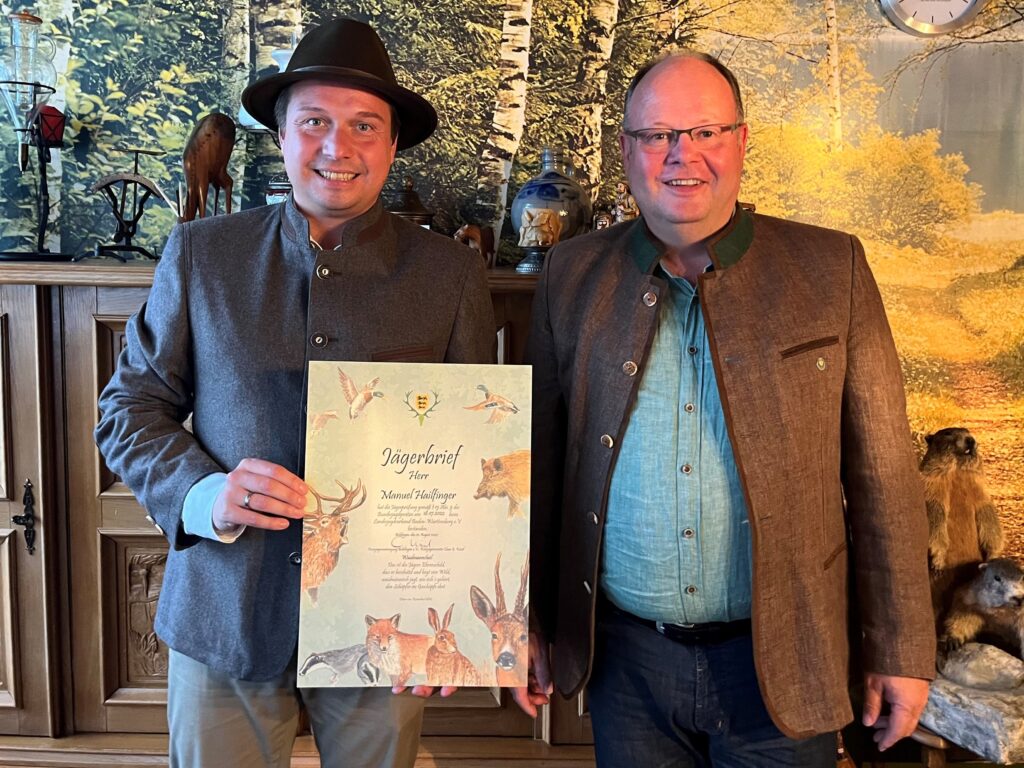 Übergabe des Jägerbriefs an Manuel Hailfinger Die Jagd ist eine verantwortungsvolle gesellschaftliche Aufgabe und hat eine lange Tradition. Eine zeitgemäße Jagd, Hege und Wildbewirtschaftung schaffen die Grundlagen für artenreiche und klimastabile Wälder sowie für vitale Wildtierbestände. Dazu will auch ich meinen Beitrag leisten.